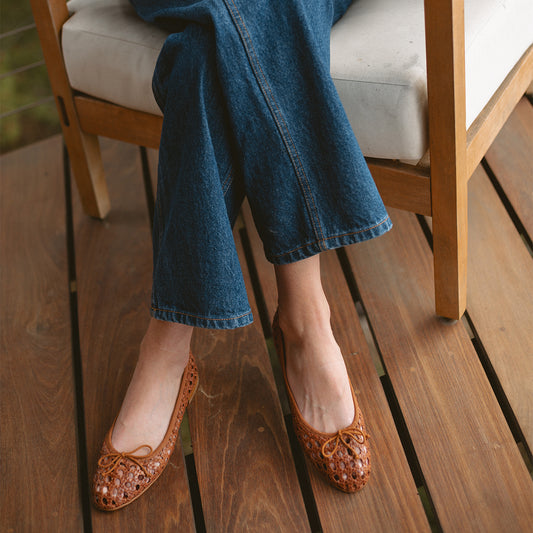 • A person wearing blue jeans and light blue ballet flats with a bow detail stands against a white background. The person’s hand, with a gold ring, rests on their knee. A person wearing blue jeans and light blue ballet flats with a bow detail stands against a white background. The person’s hand, with a gold ring, rests on their knee.