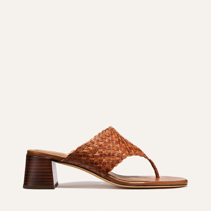 The classic thong sandal is elevated with a walkable heel height and luxurious handwoven leather.